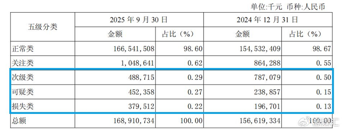 再看13.31亿元的不良贷款,其中次级类贷款约4.89亿元,较2024年末减少2.98亿元,占比0.29%,较2024年末的0.50%下降0.21个百分点;但是,可疑类贷款约4.52亿元,较2024年末增加2.13亿元,占比0.27%,较2024年末的0.15%上升0.12个百分点;损失类贷款约3.80亿元,较2024年末增加1.83亿元,占比0.22%,较2024年末的0.13%上升0.09个百分点。