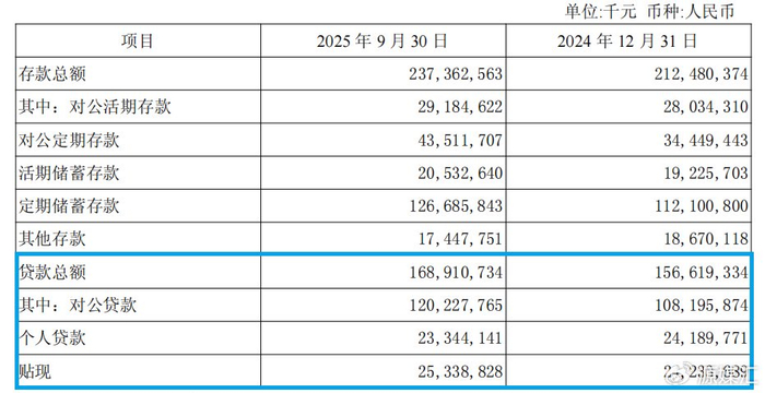 2025年前三季度,无锡银行的贷款总额约为1689.11亿元,较2024年末增加122.92亿元。其中,对公贷款1202.28亿元,较2024年末增加120.32亿元;个人贷款233.44亿元,较2024年末减少8.46亿元;贴现253.39亿元,较2024年末增加11.05亿元。