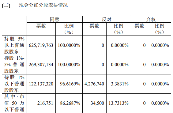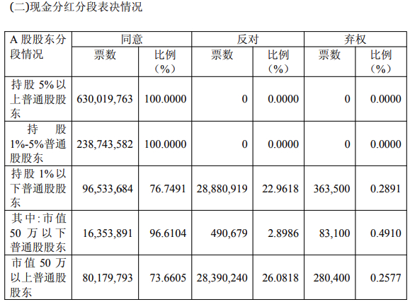 值得一提的是,在2023年度股东大会的分红方案投票上,不少中小投资者在股东大会审议环节投下了反对票。当年现金分红分段表决情况结果显示,有3.38%的持股1%以下普通股股东、13.73%的市值50万元以下普通股股东对分红方案投出反对票。