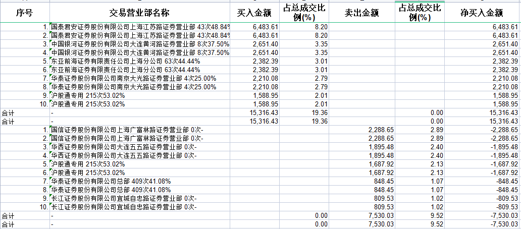 具体来看,章盟主(国泰君安证券上海江苏路证券营业部)、中国银河证券大连黄河路证券营业部分别买入6483.61万元、2651.40万元;国信证券上海广富林路证券营业部、华西证券大连五五路证券营业部分别卖出2288.65万元、1895.48万元。