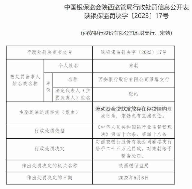 行政处罚信息公开表(陕银保监罚决字〔2023〕17号)显示,因流动资金贷款发放存在存贷挂钩违规行为,宋勃负有直接责任,根据《中华人民共和国银行业监督管理法》第四十六条、第四十八条,陕西银保监局对西安银行股份有限公司雁塔支行给予25万元罚款,对宋勃给予警告处罚。