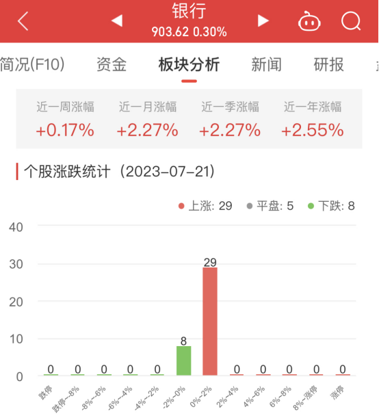 中国经济网北京7月21日讯今日,银行板块整体涨幅0.30%,其中29只股票上涨,5只股票平盘,8只股票下跌。