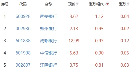 其中,西安银行、郑州银行、成都银行、中信银行、江阴银行位列板块涨幅前五位,涨幅分别为1.12%、0.95%、0.93%、0.90%、0.81%。