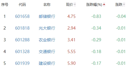 邮储银行、光大银行、农业银行、交通银行、建设银行位列涨幅榜后五位,涨幅分别为-0.83%、-0.34%、-0.29%、-0.18%、-0.17%。