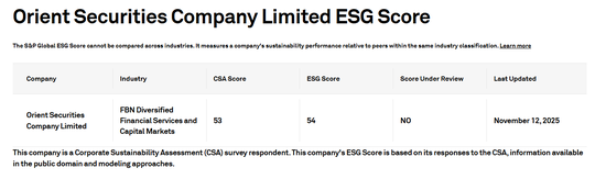 近日,国际评级机构标普全球(S&P Global)公布东方证券最新的企业可持续发展评估(CSA)得分。凭借在可持续发展领域的深耕与突破,东方证券CSA评估表现实现持续提升,2025年度CSA得分为53分(ESG分数为54分),为目前已公布成绩的中国证券公司最高分。