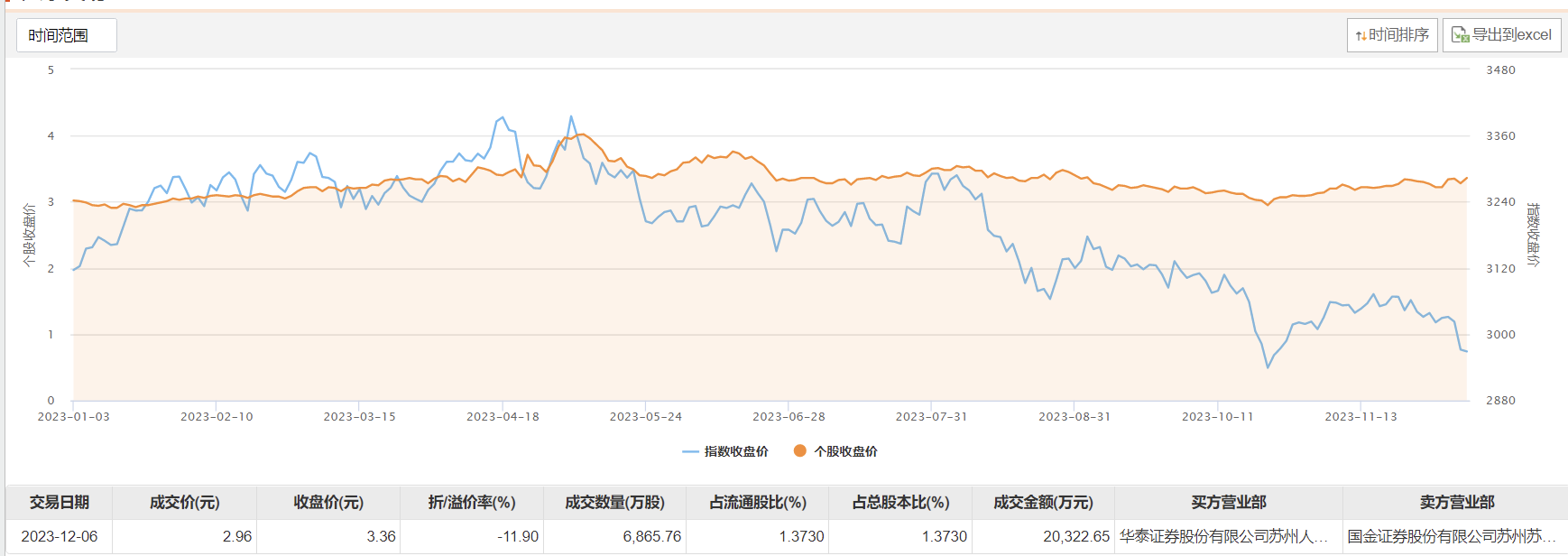 今日大宗交易成交6865.76万股,成交额2.03亿元,占当日总成交额的60.96%,成交价2.96元,较市场收盘价折价11.9%。