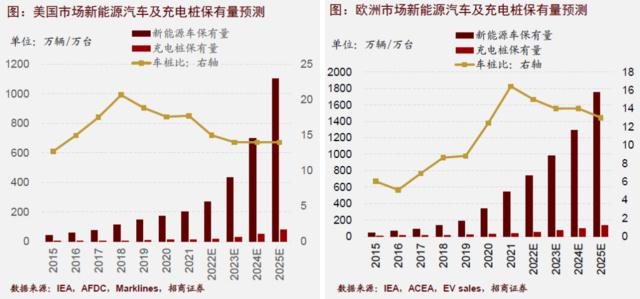 截至2021年底,美国和欧洲车桩比分别为17.72:1和16.43:1,充电桩建设严重不足。目前充电桩企业的毛利率水平国内市场约20-30%,海外市场约30-40%。未来在欧美市场技术认证完成早、销售渠道布局广,且具备技术优势的公司有望率先享受红利。