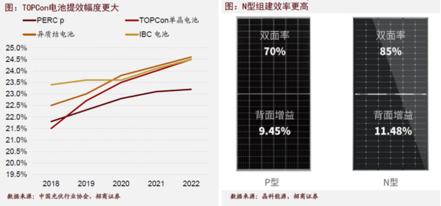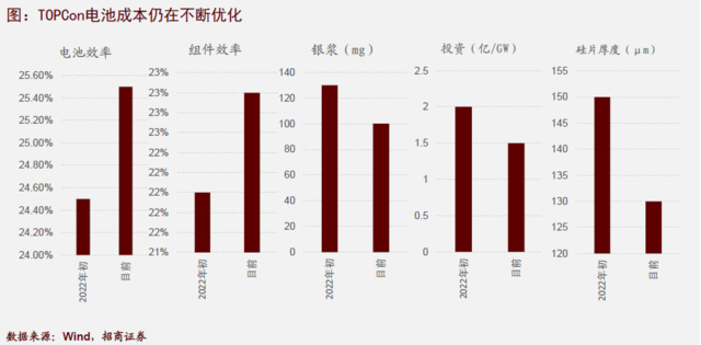效率端不断提高。据招商电新组统计,2022年初量产TOPCon效率电池端在24.5%上下,考虑封损后组件效率22%左右,至当前领先量产TOPCon电池端效率达到25.5%,组件端效率23%上下。温度系数由0.3优化至0.2x上下。