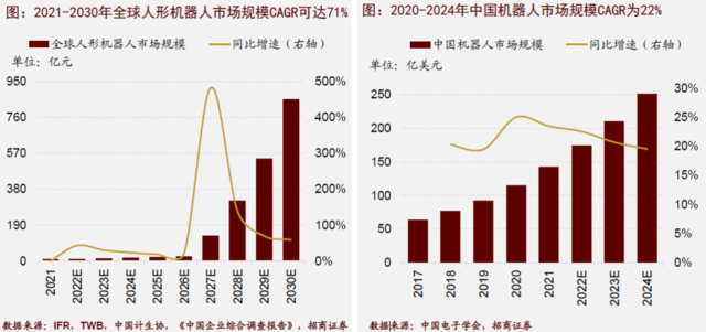 特斯拉股东大会上,马斯克称特斯拉的长期价值将主要来自人形机器人,并预测人形机器人需求将达100亿台,远超汽车,如果机器人与人的比例为2:1,需求将达到200亿台。中性预测下,2030年全球人形机器人市场规模855亿元,2021-2030年市场规模CAGR可达到71%。根据中国电子学会数据,国内机器人2024年有望达251亿美元市场规模,2020-2024年CAGR约22%。