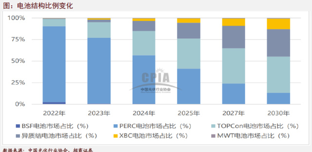 2022年,晶科能源率先启动TOPCon的大扩产,2022年末N型产能达到35GW,钧达2022年7月完成首期8GW投产,而截至当前投产N型总产能达到31GW,此外晶澳、通威、隆基、天合等均启动大规模的N型扩张。2021年PERC市占率约91%,2022年降至88%,而N型份额由2021年3%提升至9%,N型电池进入规模化应用阶段。TOPCon电池将成为下一代主流技术,据中国光伏行业协会预测,2030年TOPCon将占据一半以上的电池市场。