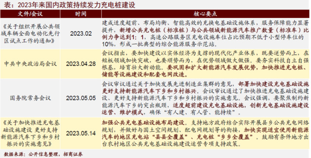 4月28日政治局会议指出,要巩固和扩大新能源汽车发展优势,加快推进充电桩、储能等设施建设和配套电网改造。5月5日,国务院常务会议,审议通过关于加快发展先进制造业集群的意见,部署加快建设充电基础设施,更好支持新能源汽车下乡和乡村振兴。5月14日,国家发改委和能源局发布文件,提出加快实现适宜使用新能源汽车的地区充电站“县县全覆盖”、充电桩“乡乡全覆盖”。