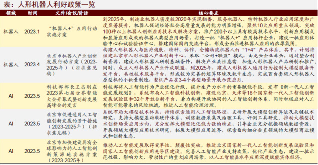 2023年1月,工信部等十七部门发布《“机器人+”应用行动实施方案》,该政策明晰了“十四五”期间机器人行业的发展目标。地方政府出台具体行动方案,落实顶层设计。4月下旬以来,北京市印发《北京市机器人产业创新发展行动方案(2023-2025年)(征求意见稿)》等文件,以推动人工智能发展取得变革性、颠覆性突破。