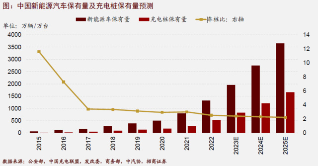 截至2022年底,我国新能源车保有量为1310万辆,充电桩保有量为521万台,车桩比为2.51。相较新能源车总量,我国充电桩量明显不足,现已成为制约新能源汽车发展的关键因素。《电动汽车充电基础设施发展指南(2015-2020年)》首次提出“一车一桩”目标,这一目标指导下,2023年我国充电桩保有量有望达到811万台,2025年有望达到1660万台,2022-2025年期间的CAGR有望达到47.15%。
