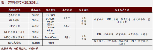 光刻胶分为半导体光刻胶、面板光刻胶、PCB光刻胶,其中半导体光刻胶技术壁垒最高。从具体各品类光刻胶国产替代情况看,目前我国g 线、i线胶国产化率最高,已突破10%;而高端领域的KrF胶、ArF胶分别初步实现量产和完成自主技术突破,且已量产的KrF胶料号覆盖种类依然较为单一。