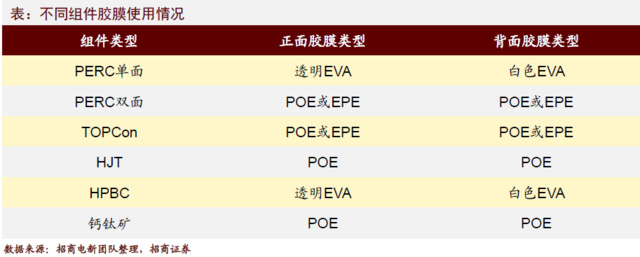 N型电池放量带动POE胶膜需求。由于N 型电池/组件效率、寿命等较PERC 有大幅提升,材料工艺选择也有差异,尤其薄硅片、低银耗等造成N 型电池对于表面应力、酸碱度更加敏感,对胶膜要求更高,相比传统EVA胶膜,POE胶膜更为适合。