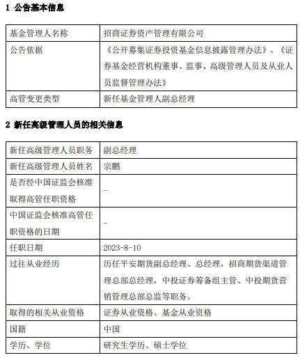 中国经济网北京8月14日讯近日,招商证券资产管理有限公司发布高级管理人员变更公告,任命宗鹏为副总经理。