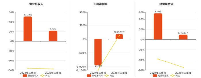 公司营业总收入为4.79亿元,较去年同报告期营业总收入减少6.49亿元,同比较去年同期下降57.55%。归母净利润为5035.57万元。经营活动现金净流入为5749.33万元,较去年同报告期经营活动现金净流入减少2.57亿元,同比较去年同期下降81.72%。
