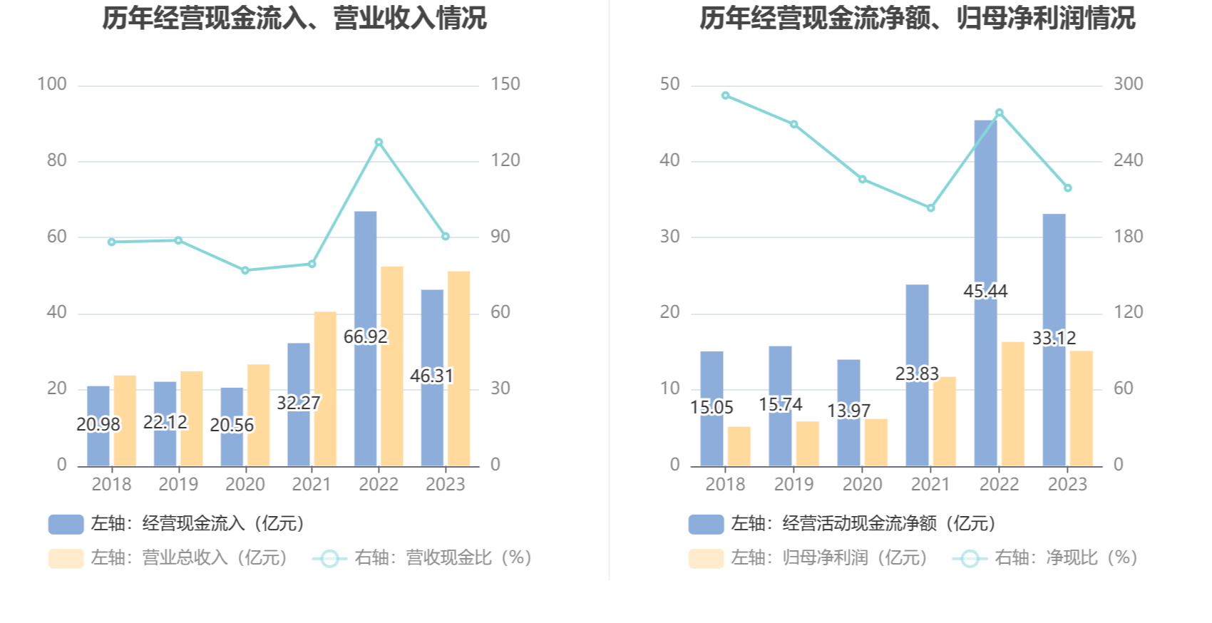 2023年,公司经营活动现金流净额为33.12亿元,同比下降27.11%;筹资活动现金流净额-45.83亿元,同比减少67.37亿元;投资活动现金流净额-1517.31万元,上年同期为-49.48亿元。