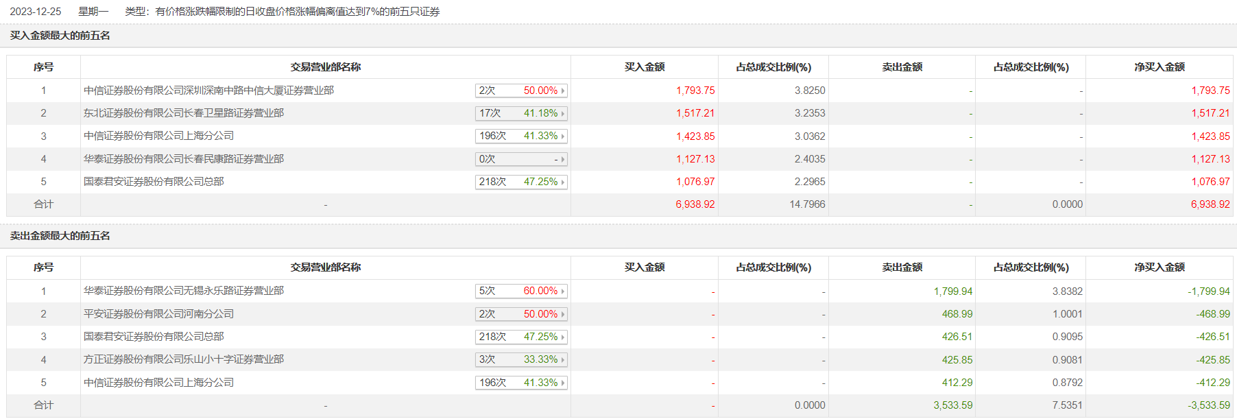 华钰矿业12月25日涨停,全天换手率达6.27%,振幅达9.47%。龙虎榜数据显示,营业部席位合计净买入3405.33万元。其中,中信证券深圳深南中路中信大厦证券营业部、东北证券长春卫星路证券营业部分别买入1793.75万元、1517.21万元;华泰证券无锡永乐路证券营业部、平安证券河南分公司分别卖出1799.94万元、468.99万元。