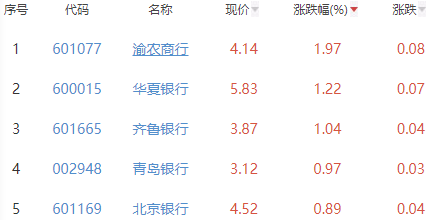 其中,渝农商行、华夏银行、齐鲁银行、青岛银行和北京银行位列板块涨幅前五位,涨幅分别为1.97%、1.22%、1.04%、0.97%和0.89%。