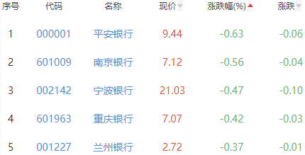 平安银行、南京银行、宁波银行、重庆银行和兰州银行位列涨幅榜后五位,涨幅分别为-0.63%、-0.56%、-0.47%、-0.42%和-0.37%。