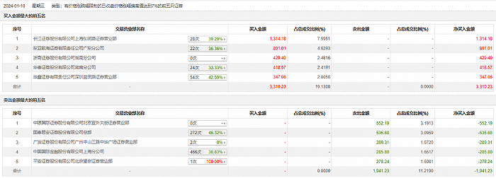 国芳集团1月10日涨停,全天换手率达4.42%,振幅达11.84%。龙虎榜数据显示,营业部席位合计净买入1369.0万元。其中,长江证券上海东明路证券营业部、东亚前海证券广东分公司分别买入1314.18万元、801.01万元;中银国际证券北京宣外大街证券营业部、国泰君安证券总部分别卖出552.19万元、535.68万元。