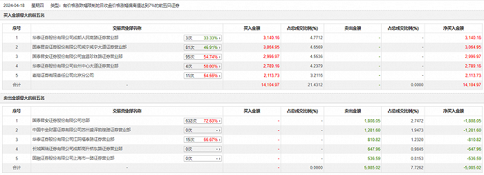 具体来看,知名游资现身龙虎榜,方新侠(华泰证券股份有限公司台州中心大道证券营业部)净买入2789.16万元。此外,华泰证券成都人民南路证券营业部、国泰君安证券咸宁咸宁大道证券营业部分别买入3140.16万元、3064.95万元;国泰君安证券总部、中国中金财富证券有限公司苏州盛泽敦煌路证券营业部分别卖出1808.05万元、1281.60万元。