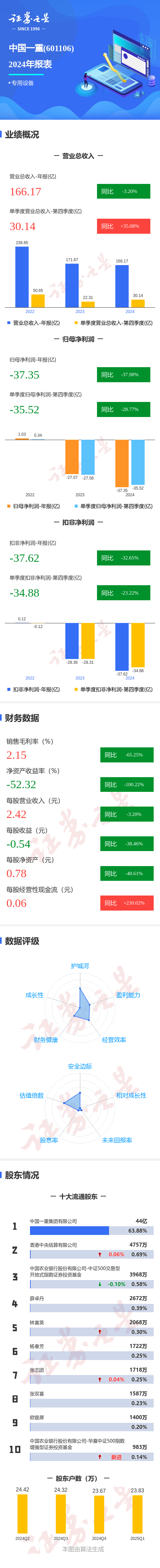 证券之星消息,中国一重2024年年报显示,公司主营收入166.17亿元,同比下降3.2%;归母净利润-37.36亿元,同比下降37.98%;扣非净利润-37.62亿元,同比下降32.65%;其中2024年第四季度,公司单季度主营收入30.15亿元,同比上升35.08%;单季度归母净利润-35.53亿元,同比下降28.78%;单季度扣非净利润-34.89亿元,同比下降23.22%;负债率85.71%,投资收益-3.21亿元,财务费用4.86亿元,毛利率2.15%。