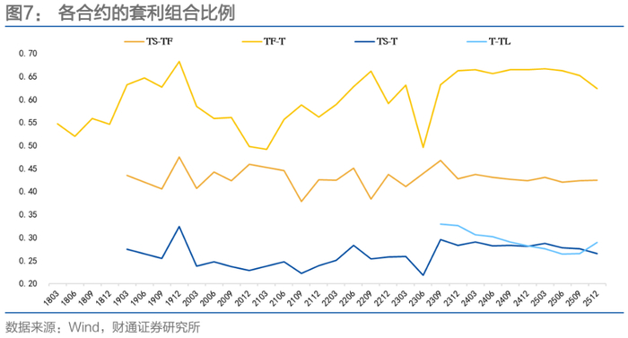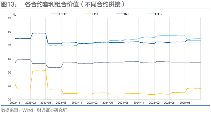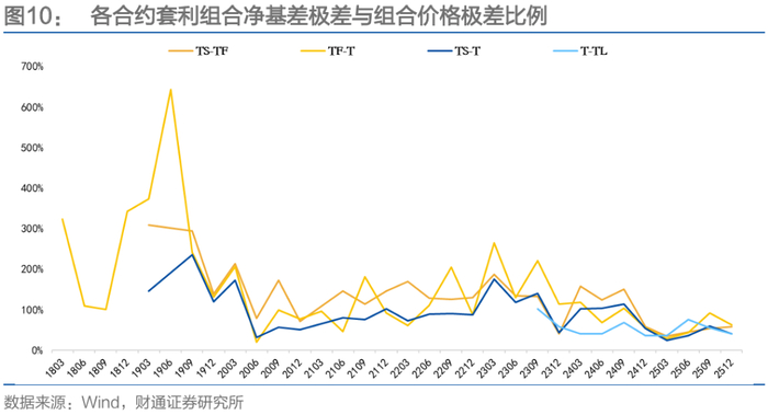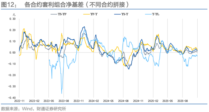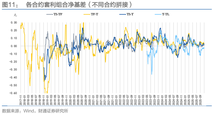 第二,资金利率组合净基差整体呈正相关。当观察主要组合净基差,整体与资金利率同向波动,其中T-TL组合净基差与资金利率规律不稳定,可能由于TL合约交易性质更强。