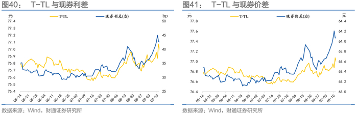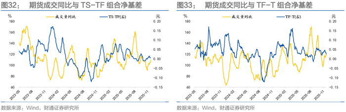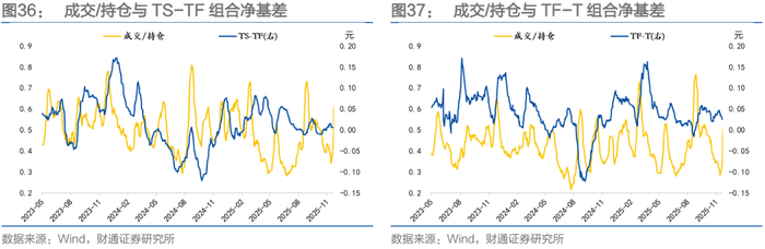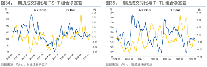 第三,成交活跃度与组合净基差在大趋势上正相关,成交除以持仓之后规律更明显。观察组合中的期货合约成交同比变化与净基差,二者在趋势上有正相关性,通过成交除以持仓进行衡量时,这一规律更加明显,当期货成交趋于活跃时,组合净基差容易上行,成交平淡时净基差回落,T-TL的规律相对不明显,可能由于TL合约以交易为主,套利属性相对较弱。