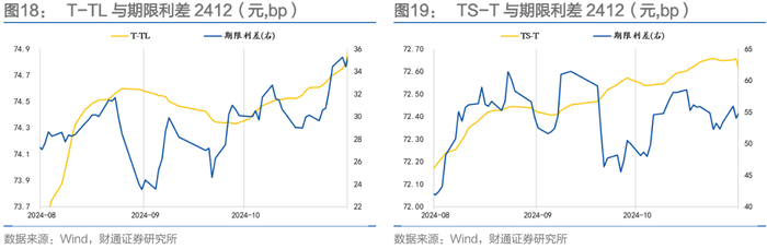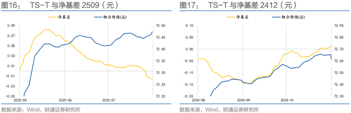 对于TS-T来说,组合价值与净基差走势之间的关系也不稳定,2312、2409、2412、2506合约上相关性较强,2403、2406、2503、2509相关性较弱。