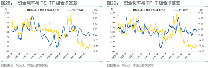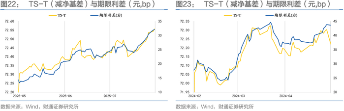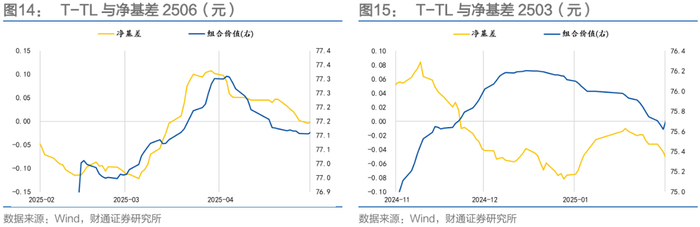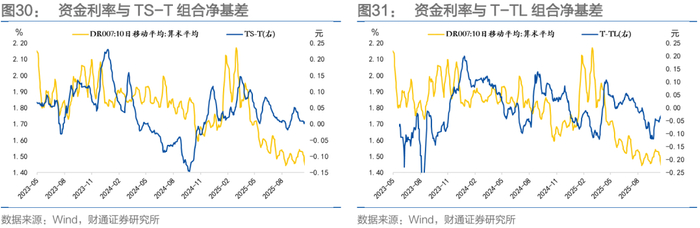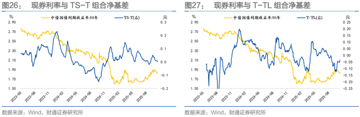 第一,2024年债市利率与净基差整体呈正相关,2025年以来走势规律出现分化,2024年利率下行过程中,主要组合净基差整体下行,二者呈正相关规律,但2025年以来债市波动减弱,组合净基差规律也出现分化,5月以来利率上行过程中各组合净基差回落,有一定的负相关性。