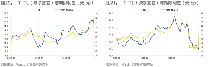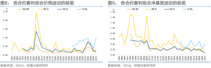 2018年以来,除去2020年,其余年份各套利组合在主力合约的3个月内价格波动通常不超过1元,且大部分时间在0.5元以内。而净基差波动通常不超过0.6元,一般维持在0.2-0.4元之间,目前T-TL组合的净基差波动仍然维持较高。