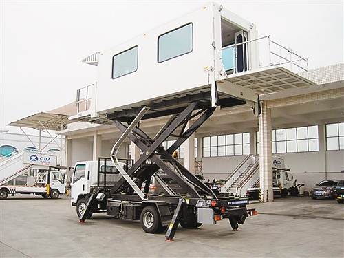 可以看到国外机场使用客梯车远机位登机时,客梯车地板与舱门也有至少十几厘米的高度差当然,郑智化所使用的并非客梯车,因为客梯车都是一级级台阶,轮椅上不来。把他送上飞机用的是一种更为少见的车型,那就是升降平台车。如果单从外形与运作模式来看的话,升降平台车其实和飞机的餐车还挺相似的,都是把车厢升高后地板与舱门口对接,进行人员来往或者运输。