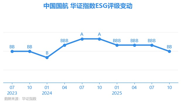 日前,华证指数公布了新一期(2025年10月31日)的ESG评级结果,中国国航(601111.SH)获得BB评级(华证指数评级为C起至AAA九档,C为最低档,AAA为其最高一级评级/AA为其第二档),上一期(2025年7月31日)ESG评级为BBB。本期ESG评级在7家客运航空公司行业A股上市公司中排名第3(上一期排名第3)。