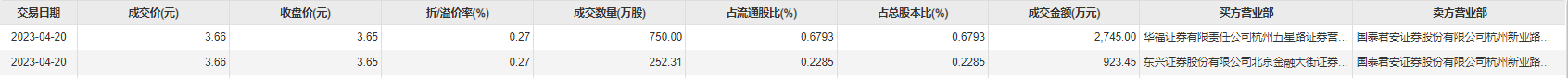4月20日大宗交易成交1002.31万股,成交额3668.45万元,占当日总成交额的73.11%,成交价3.66元,较市场收盘价3.65元溢价0.27%。