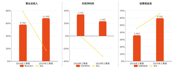 公司营业总收入为11.45亿元,较去年同报告期营业总收入增加1.70亿元,实现2年连续上涨,同比较去年同期上涨17.47%。归母净利润为1.16亿元,较去年同报告期归母净利润减少5458.32万元,同比较去年同期下降32.00%。经营活动现金净流入为5.75亿元,较去年同报告期经营活动现金净流入增加2.29亿元,实现2年连续上涨,同比较去年同期上涨66.00%。