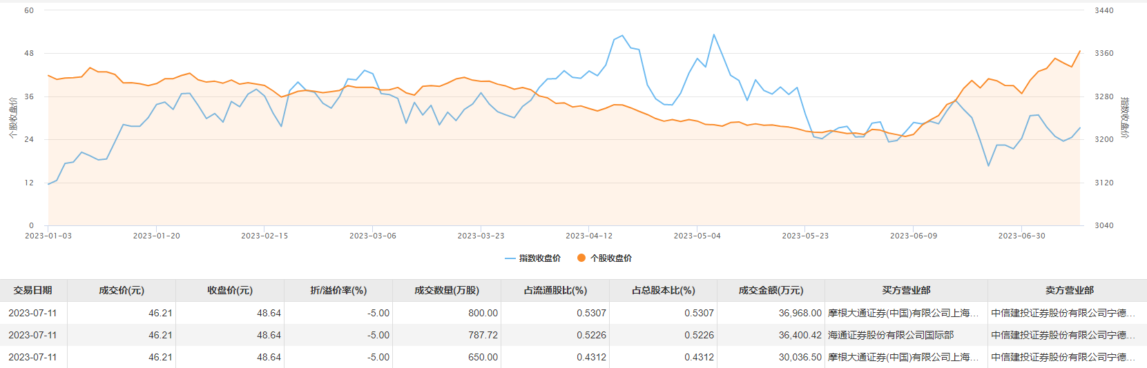 7月11日大宗交易成交2237.72万股,成交额10.34亿元,占当日总成交额的18.45%,成交价46.21元,较市场收盘价48.64元折价5.0%。