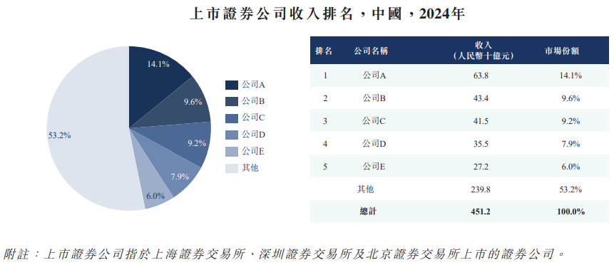 根据弗若斯特沙利文(Frost & Sullivan)报告,以收入计的中国证券行业市场规模在2020年至2024年间从人民币4,485亿元增长至人民币4,512亿元,年复合增长率为0.1%。预计到2029年将增长至人民币5,743亿元,2024年至2029年的年复合增长率为4.9%。