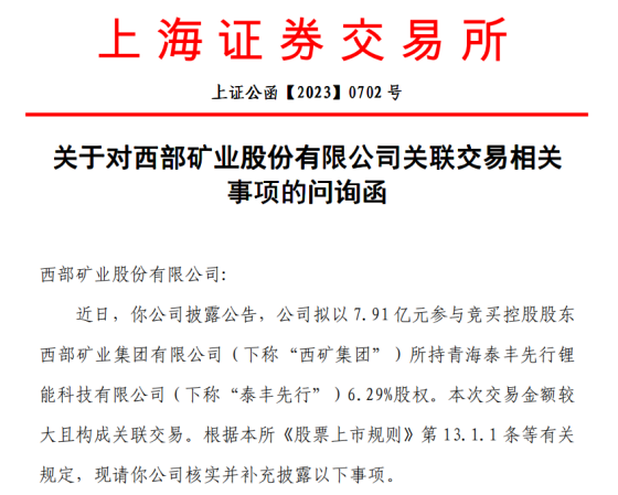记者注意到,近年来,西部矿业频繁购买控股股东西矿集团的资产。除竞买泰丰先行6.29%的股权外,今年1月,西部矿业全资子公司青海铜业以8827.08万元受让控股股东西矿集团所持青海西矿同鑫化工有限公司67.69%股权,目前已完成工商变更登记;2022年,上市公司向西矿集团购买其持有的锂资源公司27%股权,交易对价33.43亿元。