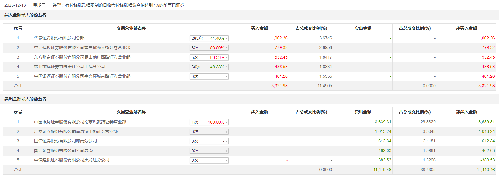 12月13日,杭齿前进今日涨停,全天换手率达7.24%,振幅达10.82%。龙虎榜数据显示,营业部席位合计净卖出7788.48万元。其中,华泰证券总部、中信建投证券南昌桃苑大街证券营业部分别买入1062.36万元、779.32万元;中国银河证券南京洪武路证券营业部、广发证券南京汉中路证券营业部分别卖出8639.31万元、1013.24万元。