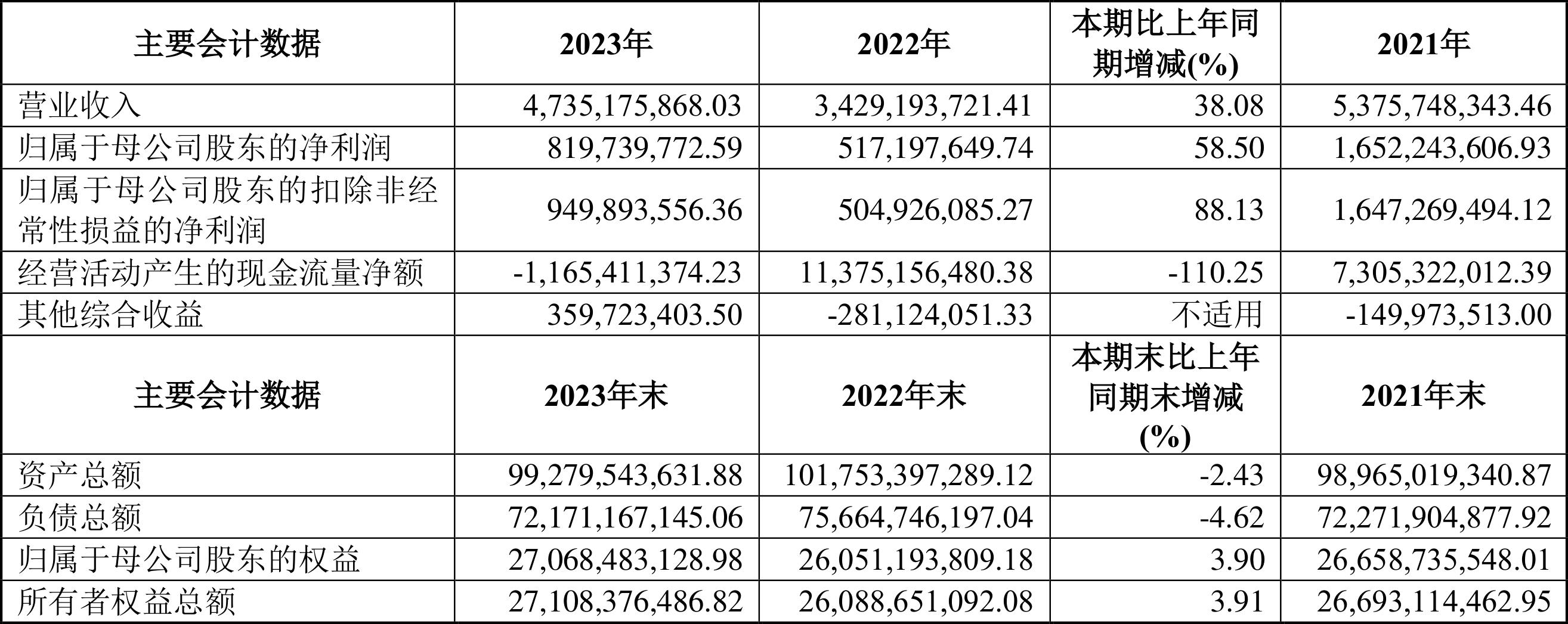 2023年,公司经营活动现金流净额为-11.65亿元,同比减少125.41亿元;筹资活动现金流净额-19.91亿元,同比增加37.39亿元;投资活动现金流净额-11.57亿元,上年同期为-100.55亿元。