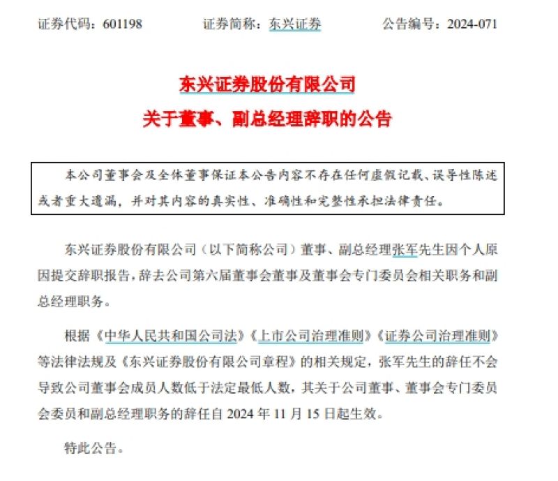 11月15日晚间,东兴证券(601198.SH)发布公告称,公司董事、副总经理张军因个人原因提交辞职报告,辞去公司第六届董事会董事及董事会专门委员会相关职务和副总经理职务,其辞任自当天起生效。