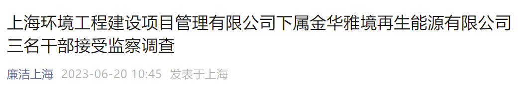 “廉洁上海”发文表示,据上海市宝山区纪委监委消息:上海环境工程建设项目管理有限公司下属金华雅境再生能源有限公司总经理钱千春、合约部经理陈初、原建设总监舒畅涉嫌严重违法,目前正接受上海市宝山区监察委员会监察调查。