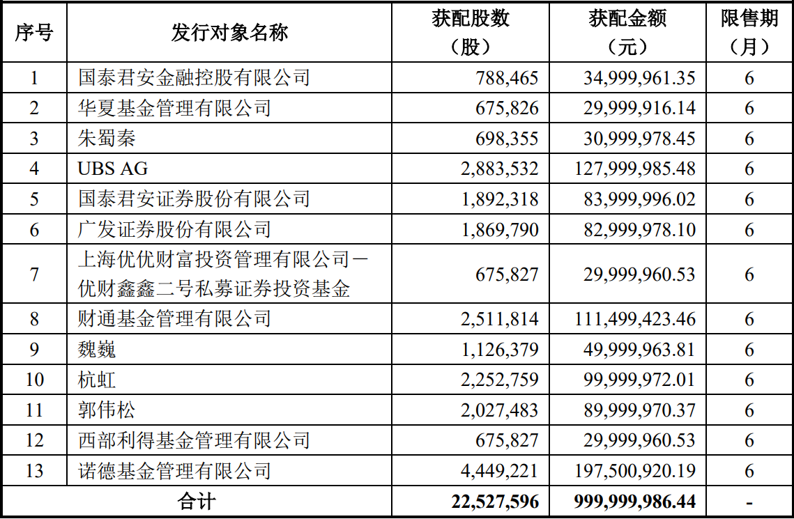1月15日公告,本次拟以44.39元/股之价格发行2252.75万股公司股份,募集资金10亿元。华夏基金、