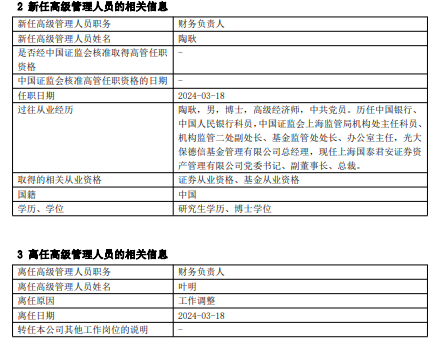 中国经济网北京3月20日讯今日,上海国泰君安证券资产管理有限公司发布基金行业高级管理人员变更公告,任命陶耿为财务负责人,叶明离任。
