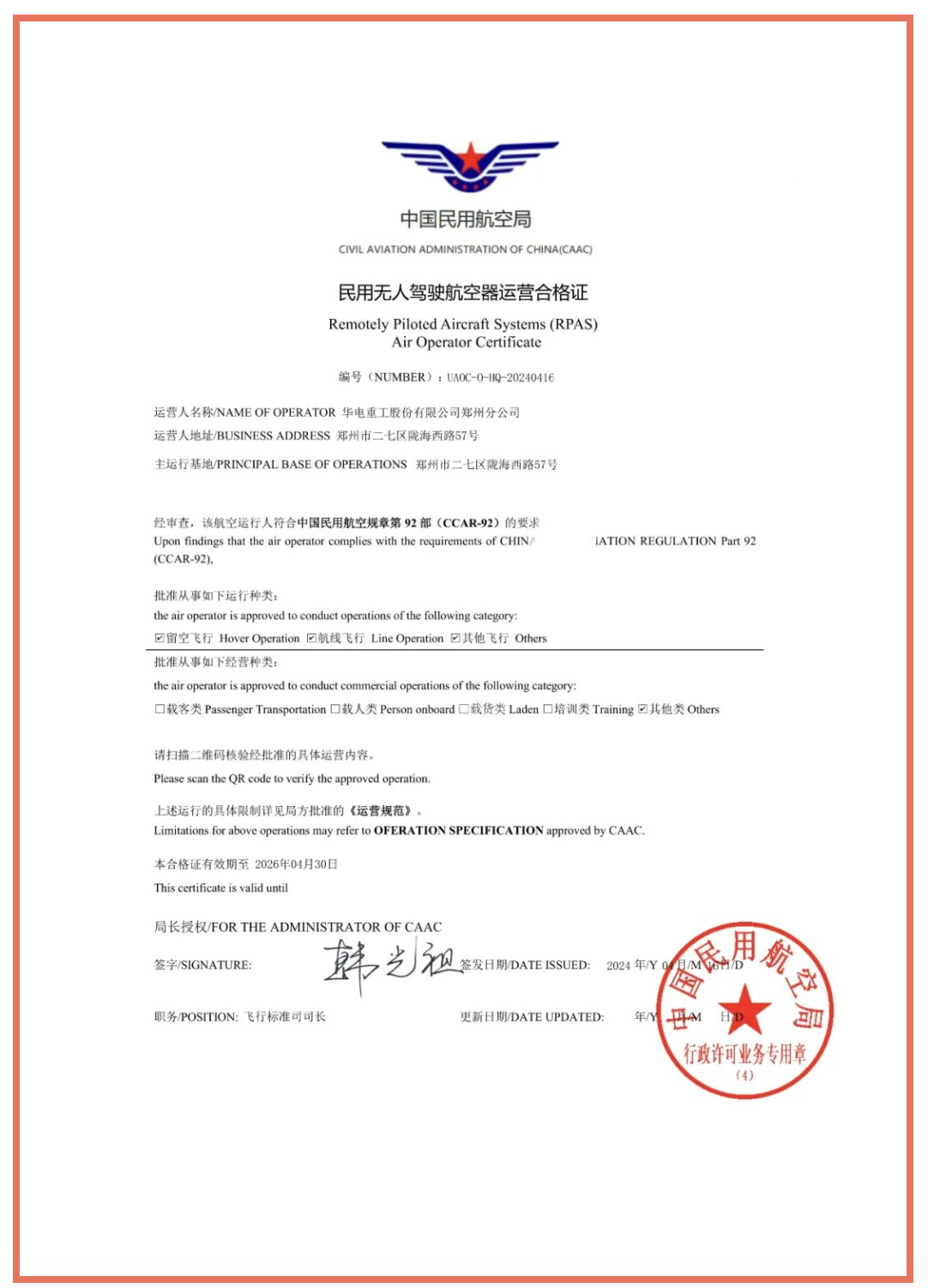 e公司讯,华电重工官微消息,经中国民用航空局核准,华电重工郑州分公司获民用无人驾驶航空器运营合格证。此项运营资格是公司在无人机运营方面具备了完整的技术实力和管理能力的体现,为公司数字化业务的发展提供了坚实保障。