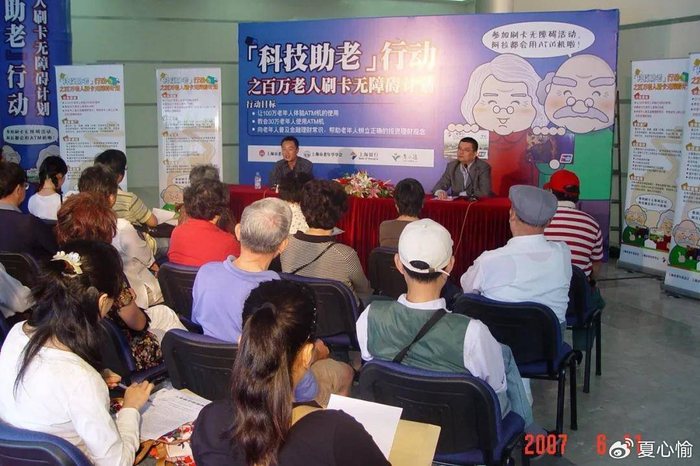 上海银行敏锐觉察到养老客户服务更深层次、精细化的需求变迁,着力开展厅堂为主阵地的适老化改造。2007年,上海市启动“科技助老”行动,上海银行与上海市老年基金会、上海市老年学学会共同策划组织“科技助老——百万老人刷卡无障碍计划”,上海银行导银志愿者由此诞生。每到领取养老金的高峰日,400多名“导银”志愿者在上海银行近200个网点驻守,通过“老人帮老人”的方式,教老年客户使用自助机具,消除他们对自助机具的陌生感,大大缓解高峰日老人长时间排队等候情况。