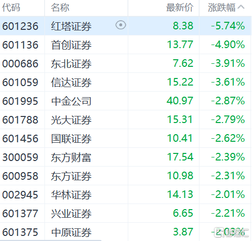 格隆汇4月21日丨红塔证券跌超5%,首创证券跌超4%,东北证券、中金公司、光大证券等纷纷走低。