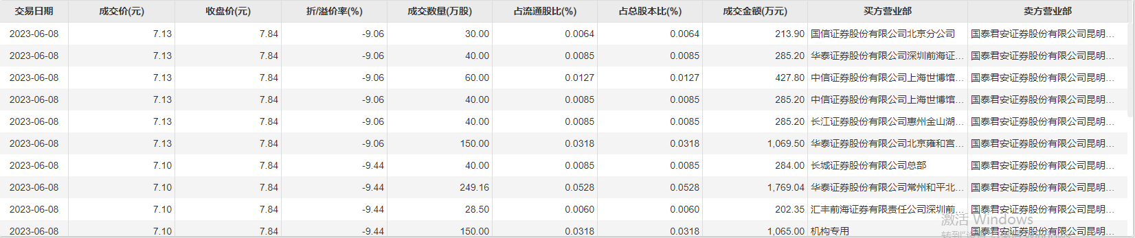 红塔证券6月8日大宗交易成交1958.49万股,成交额1.39亿元,占当日总成交额的56.35%,成交均价7.11元,较市场收盘价7.84元折价9.31%,其中最高成交价7.13元,最低成交价7.1元。